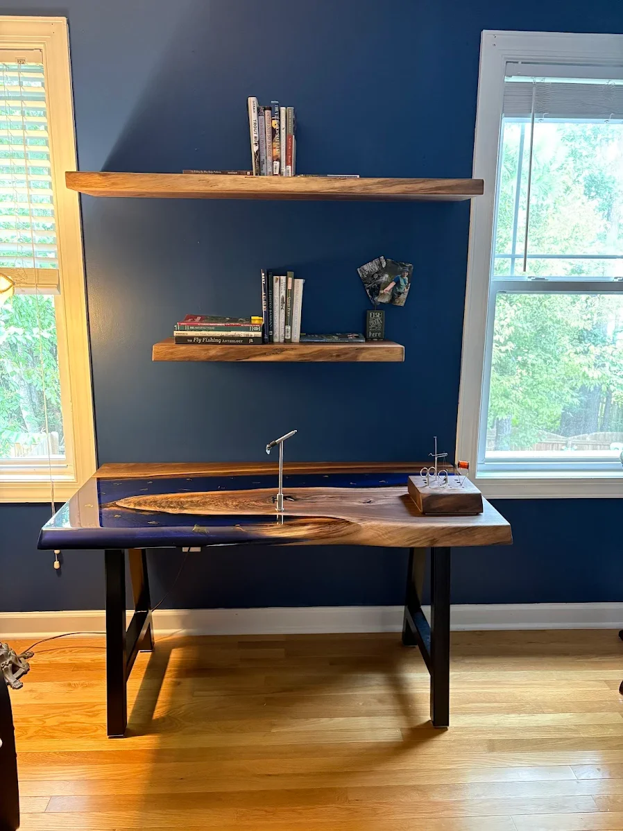 If you are a fly fisher or someone who enjoys and appreciates the beauty of wood and wood crafted into works of functional art, then Andy at Live Edge Exclusives is your man. Andy worked with me to create a stunning handcrafted live edge fly-tying stand-alone station to my specifications. This is an exceptional piece that combines functionality with the natural beauty of wood and the wonder of the outdoors. I met Andy in May 2024. I immediately recognized the quality of his work and enthusiasm for his creations. Not one to make snap decisions, left the festival thinking about having a small fly-tying tabletop station made. I checked out the website and began to follow his Facebook page. My next contact with Andy was a year later. Now I was ready to order a fly-tying station. Andy and I outlined in general terms what I wanted, size, wood (walnut, oak, maple, etc.), epoxy color, and hardware. I followed up with Andy on the details. Then I changed my mind. Over the next month Andy patiently worked with me, via email, texts, and phone calls, as I went from an 18in tabletop fly-tying station to a stand-alone fly-tying desk.